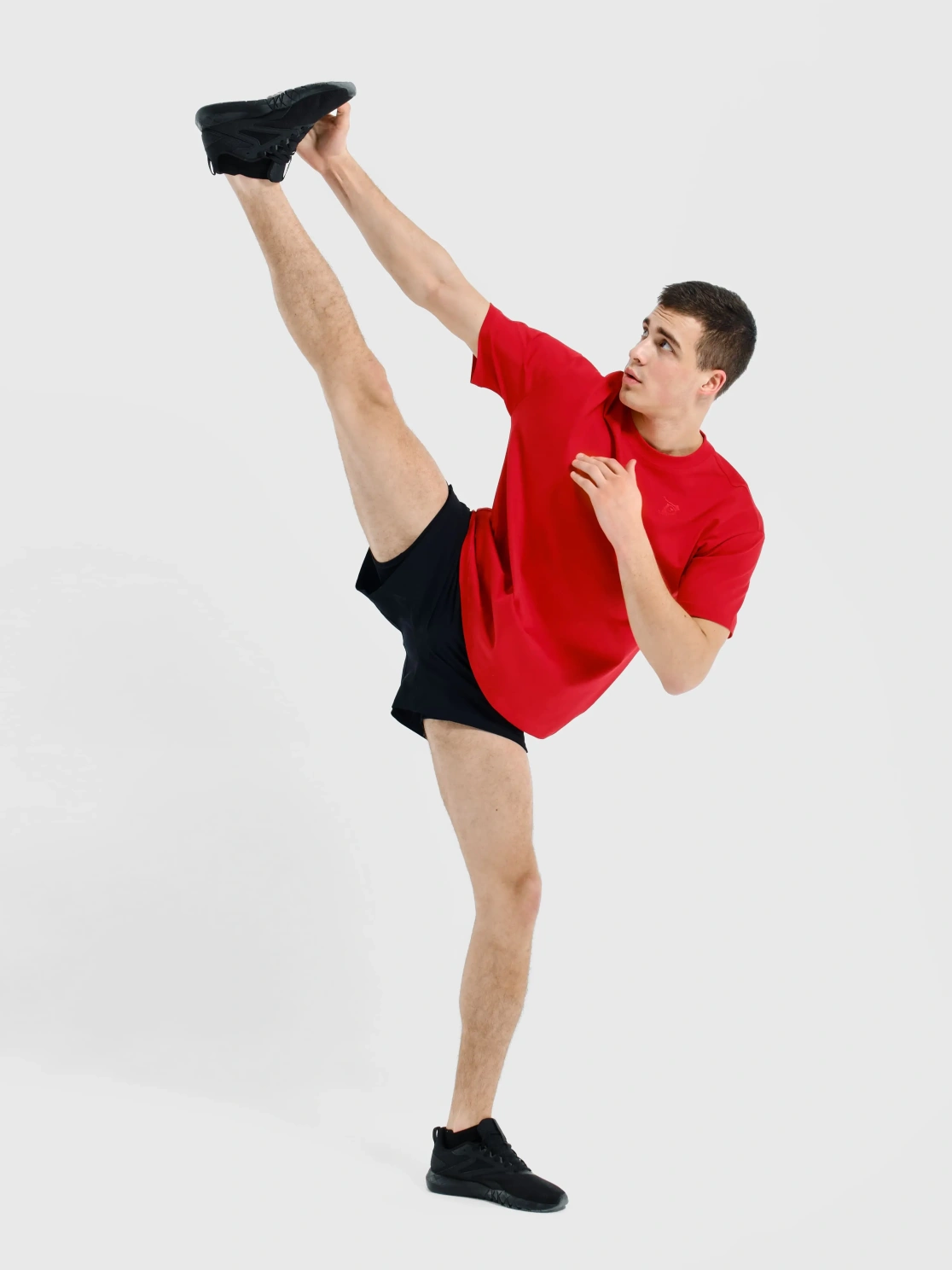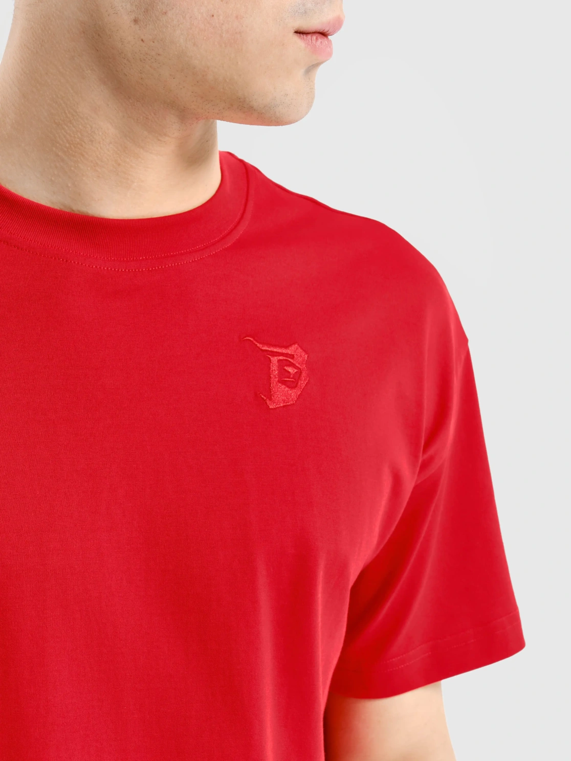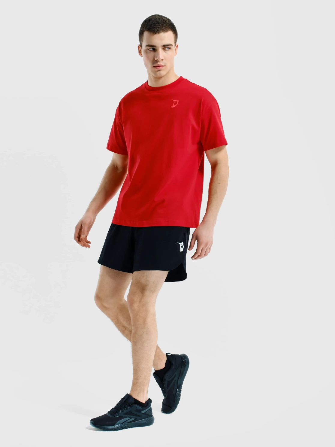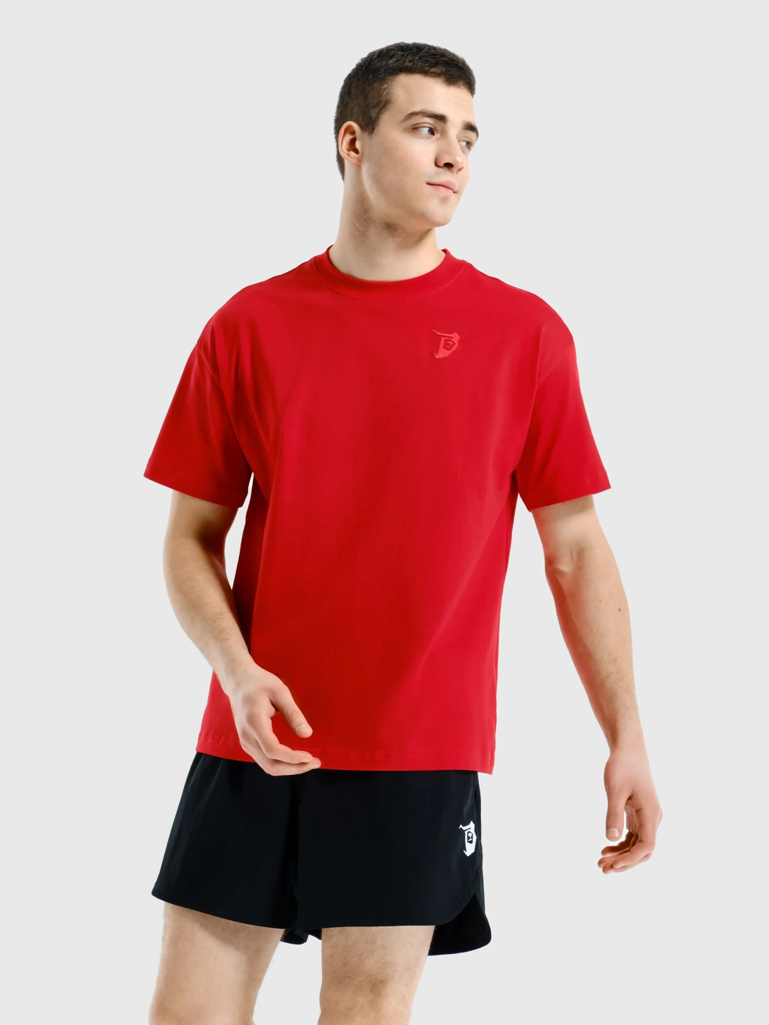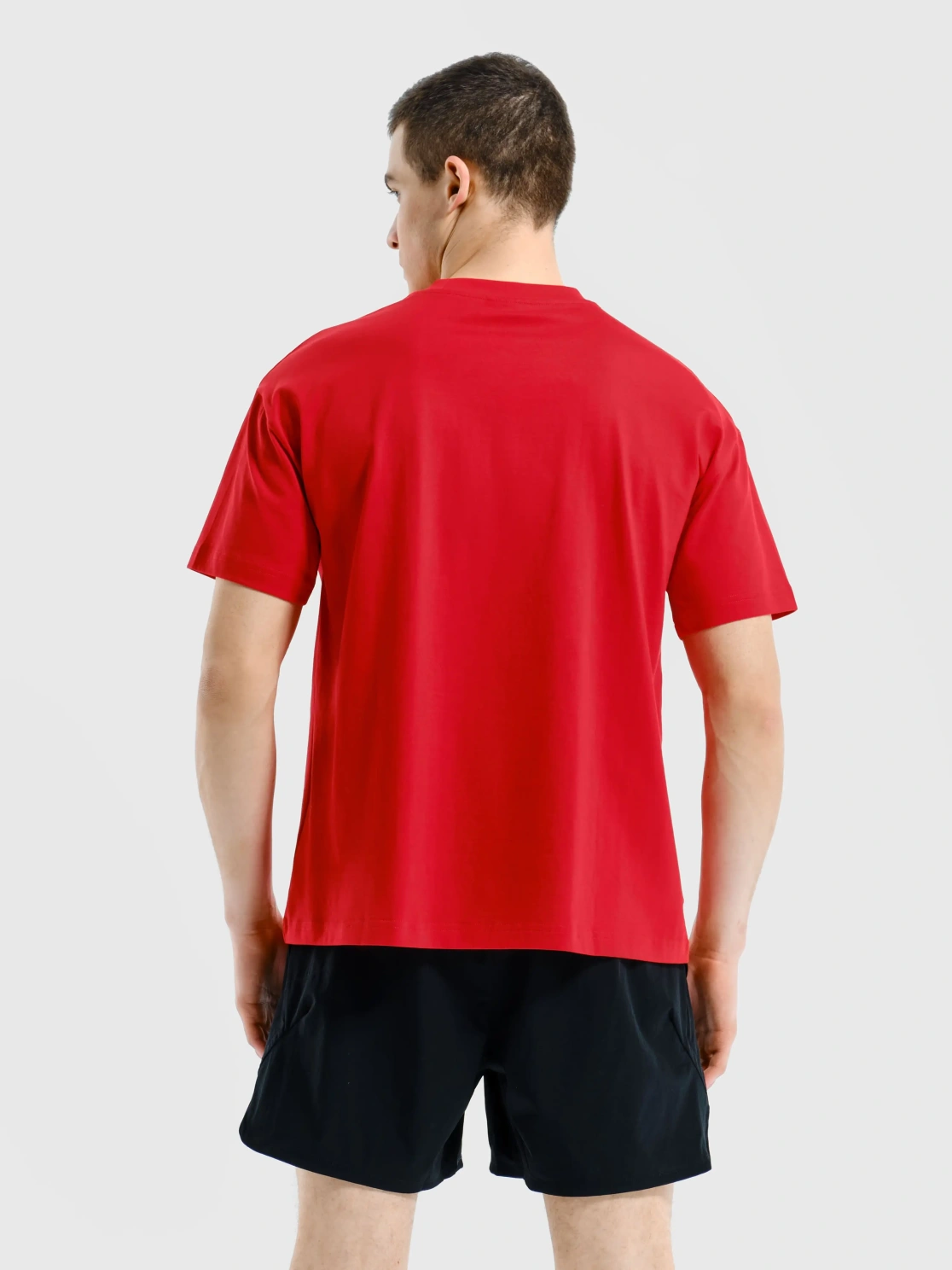 Мужская футболка с логотипом на груди — хорошее сочетание комфорта и стиля. Фасон оверсайз не сковывает движения. В такой футболке вы будете выглядеть стильно, как на занятиях в зале, так и на прогулках. Модель выполнена в красном цвете.