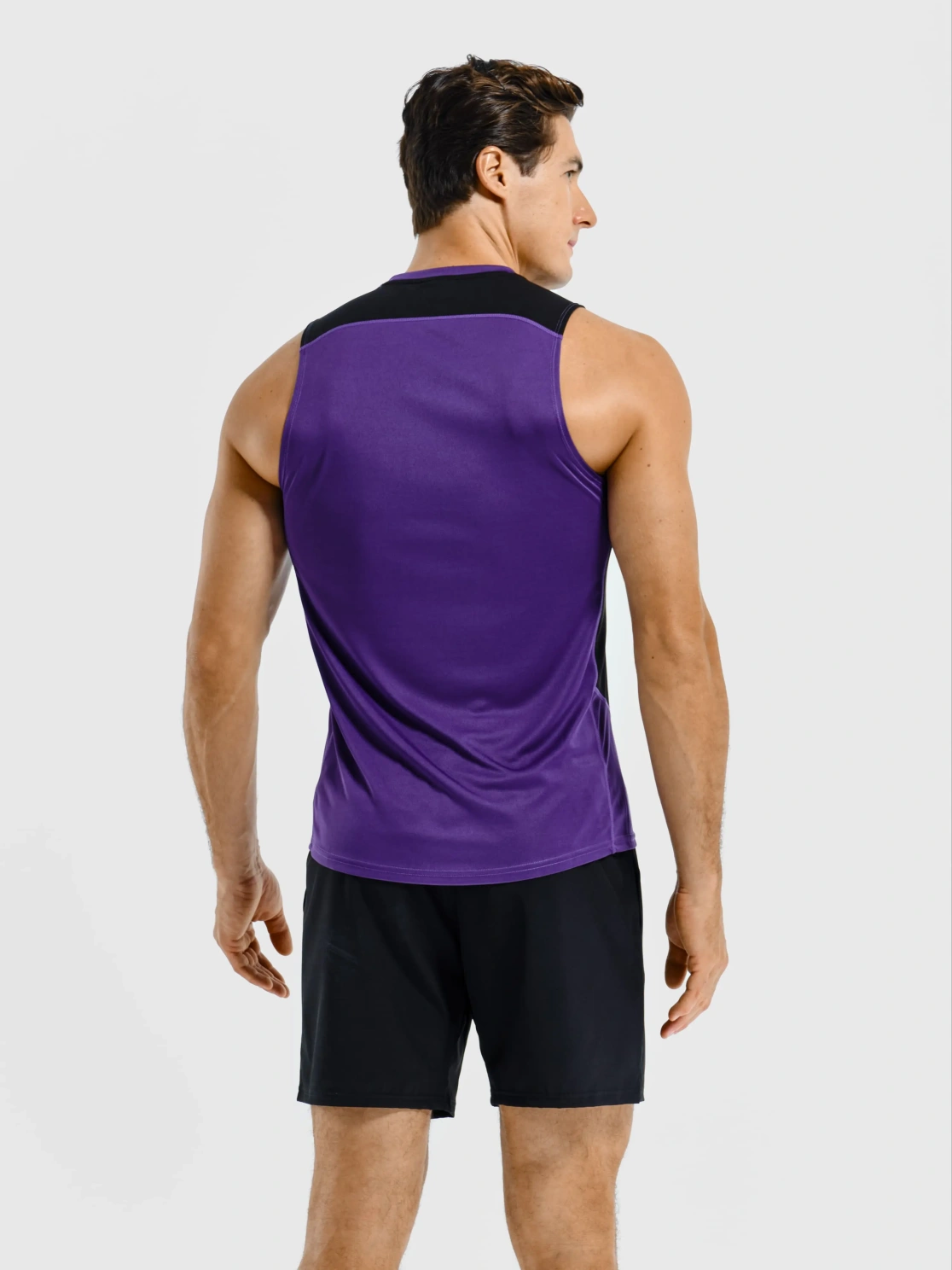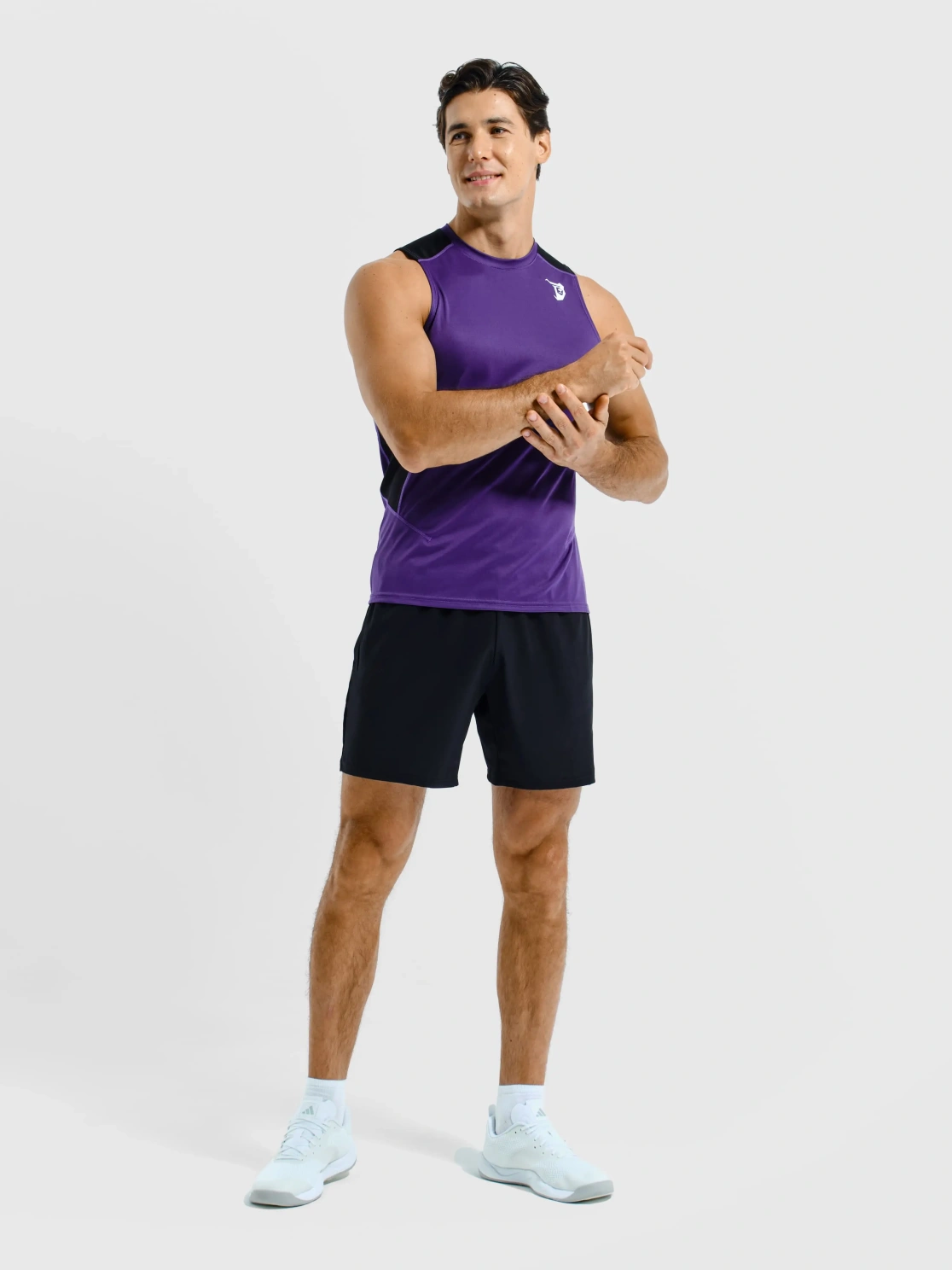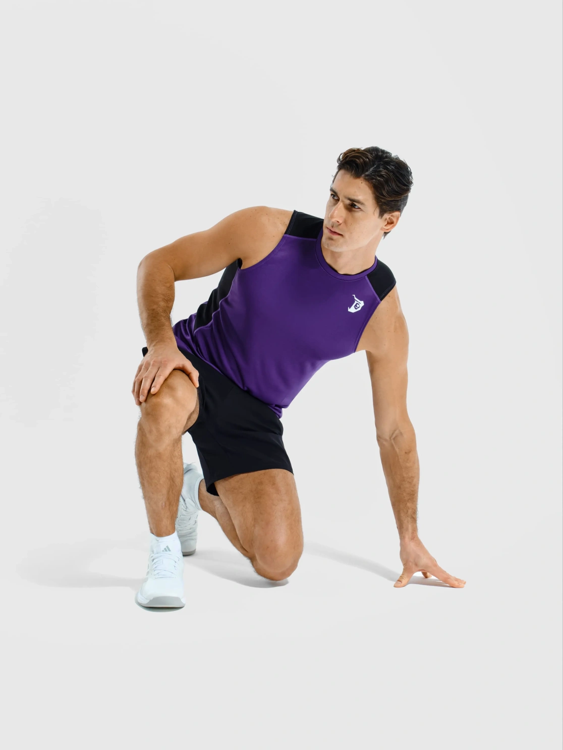 Мужская майка для бега с логотипом медведя на груди и фирменной надписью на спине. Модель выполнена в фиолетовом цвете. Сочетать майку можно с разными спортивными аутфитами. Прямой силуэт и средняя длина изделия обеспечивают хорошую посадку по фигуре. Заниматься бегом теперь можно с комфортом.