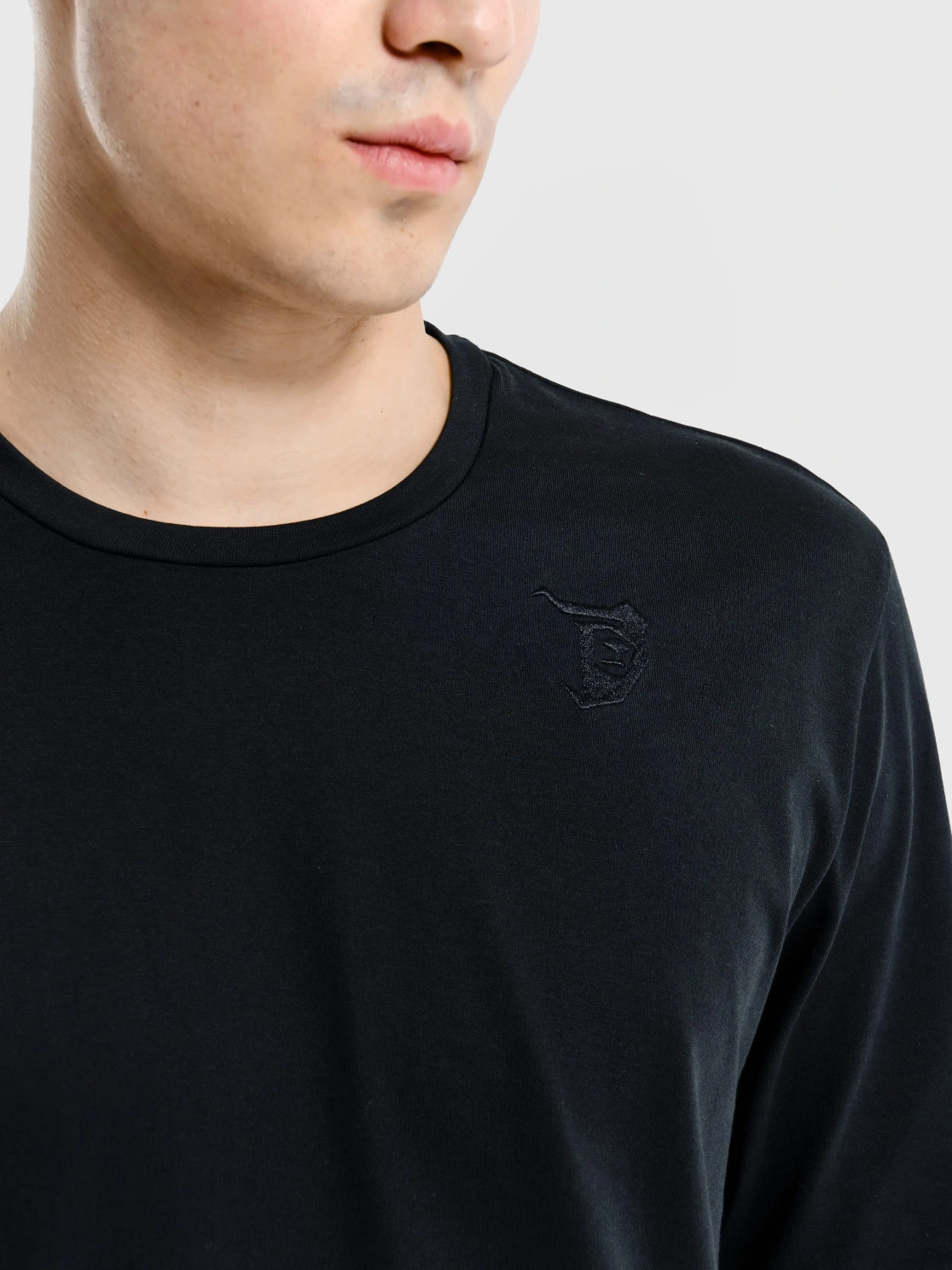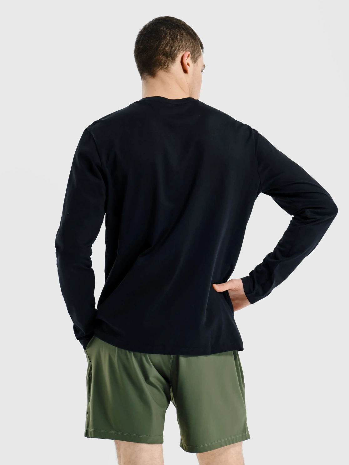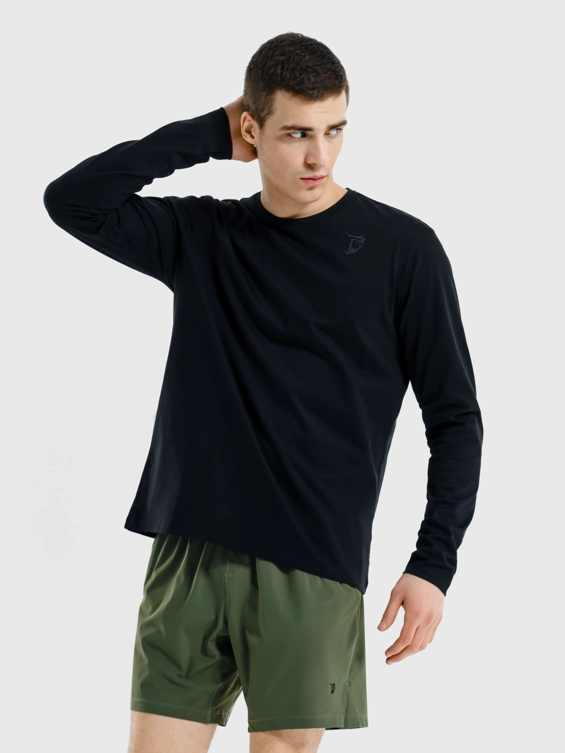 Мужской лонгслив в черном цветовом варианте. Хорошо сочетается с одеждой для тренировок, а также будет стильно смотреться с вещами в спортивном стиле. На груди логотип медведя. Фасон прямой, не стесняющий движений.