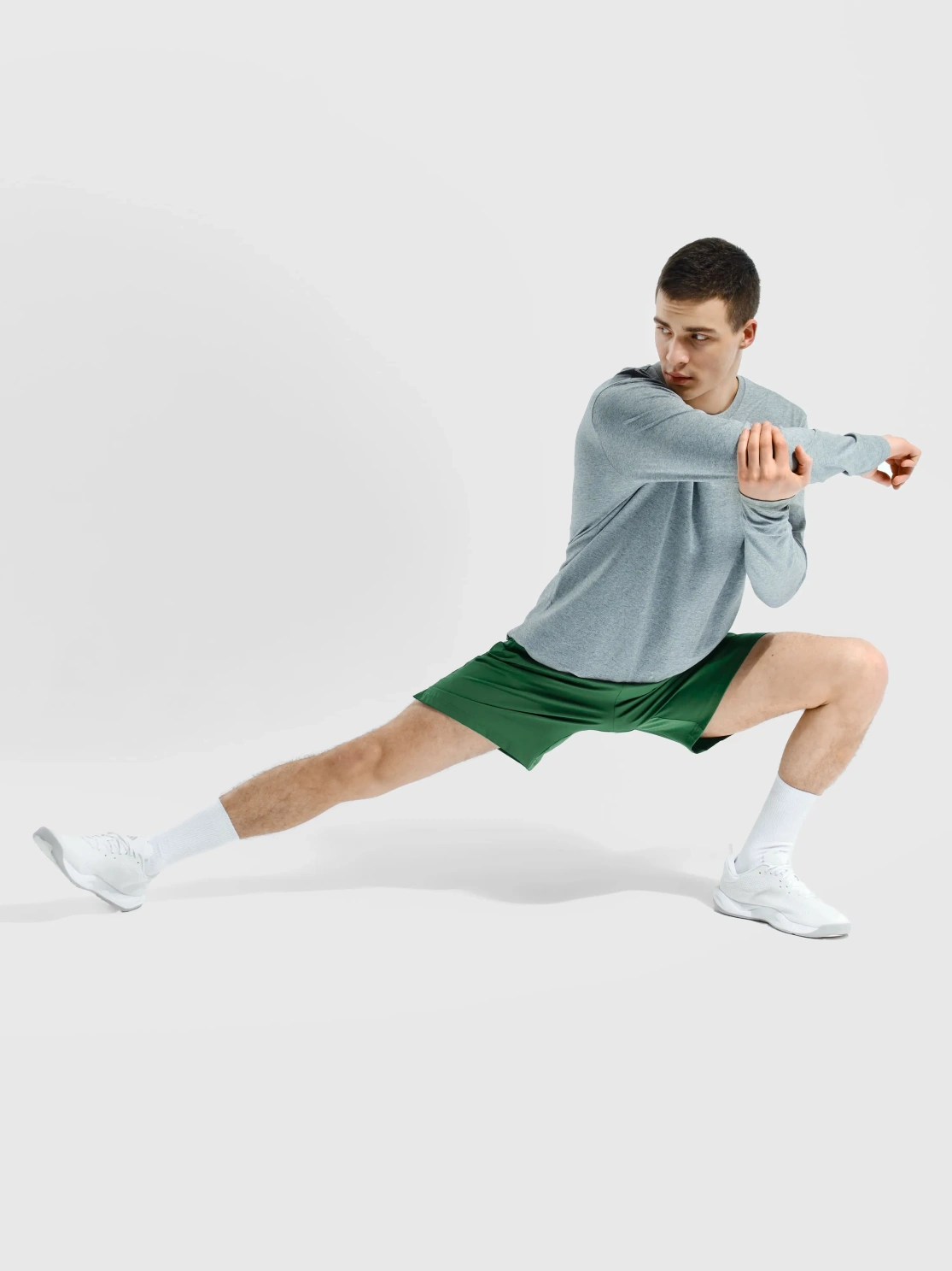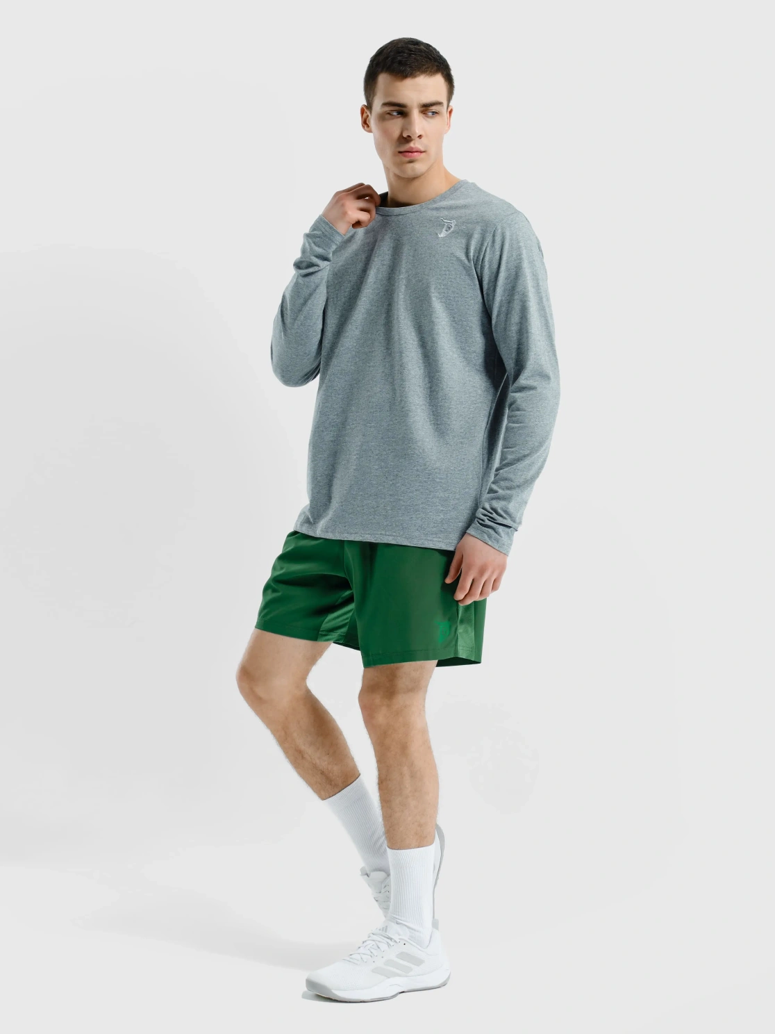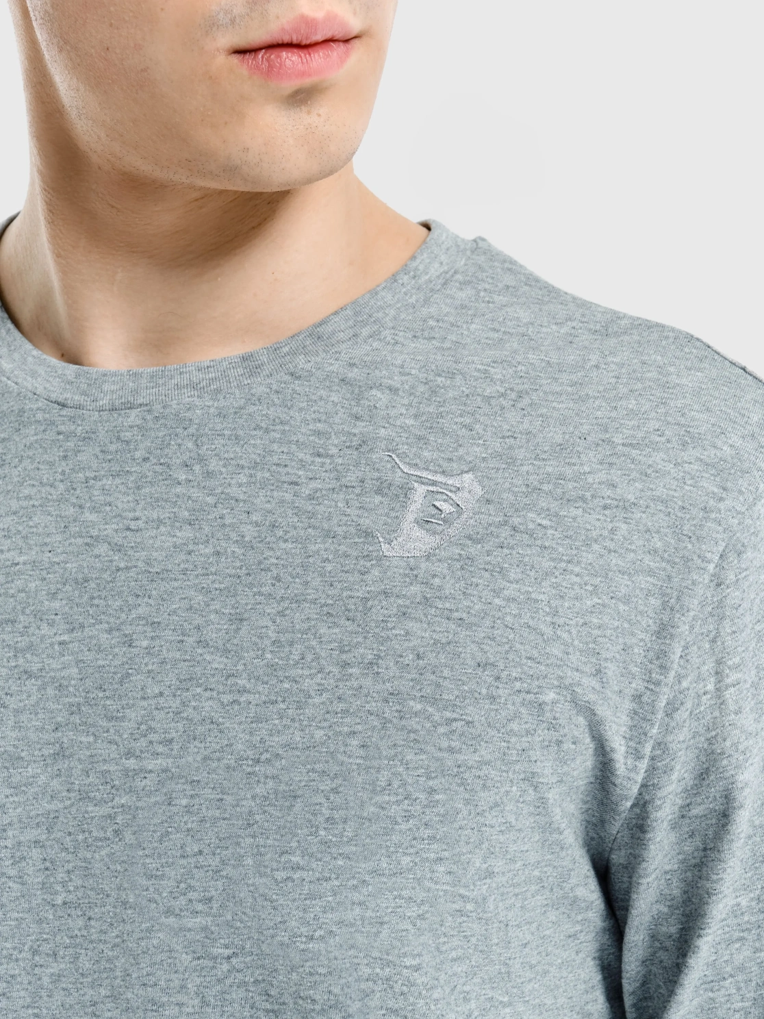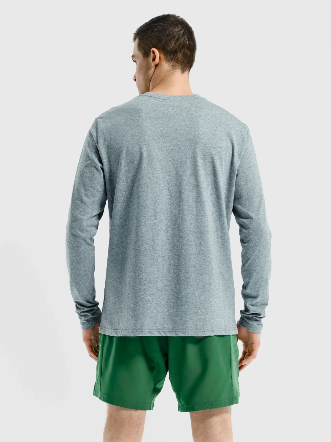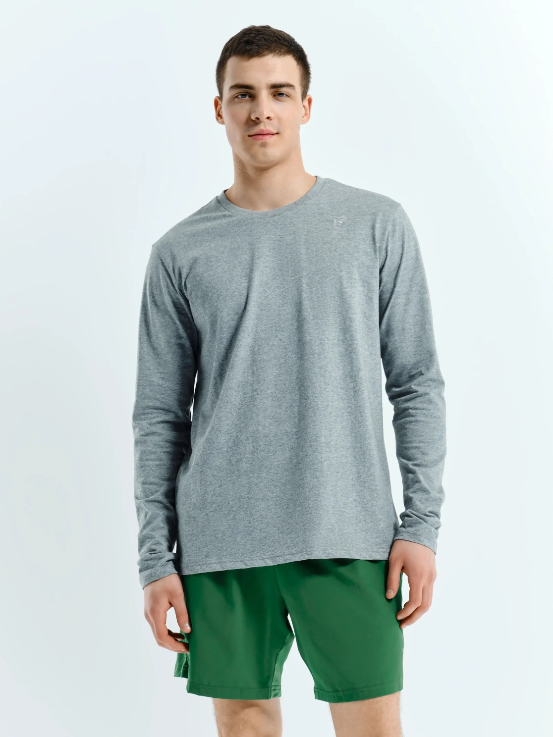 Мужской лонгслив в сером цветовом варианте. Хорошо сочетается с одеждой для тренировок, а также будет стильно смотреться с вещами в спортивном стиле. На груди логотип медведя. Фасон прямой, не стесняющий движений.