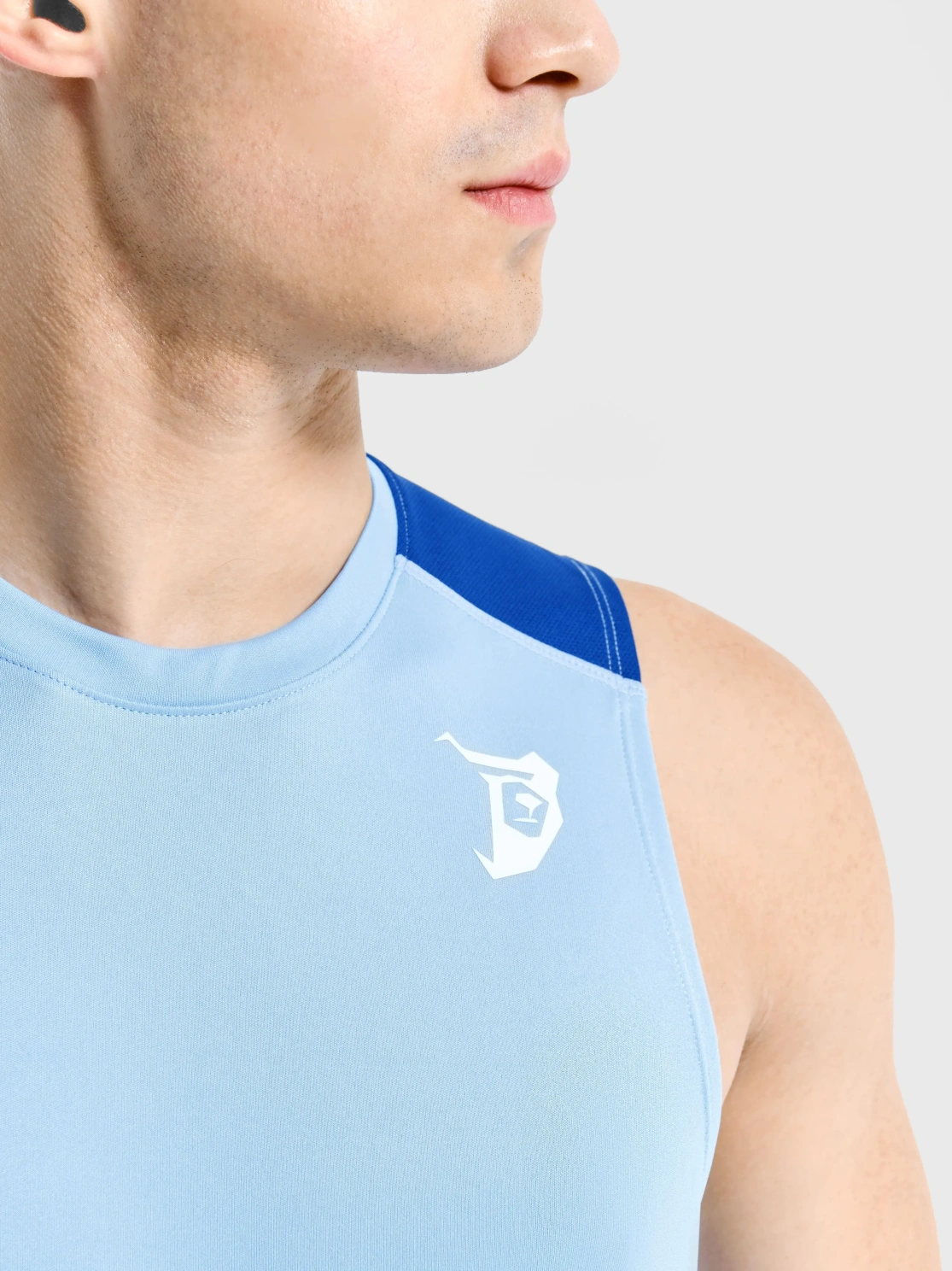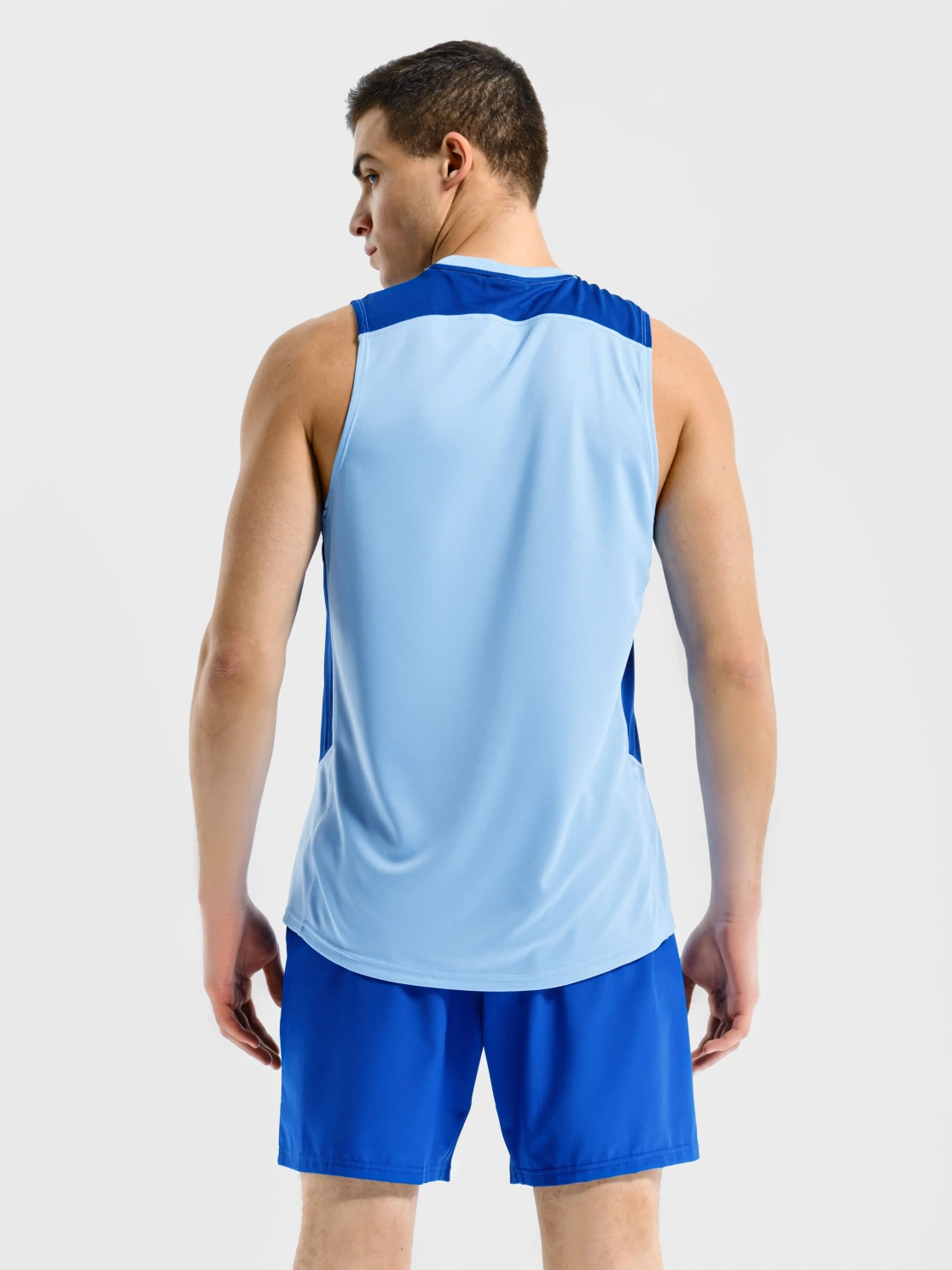 Мужская майка для бега с логотипом медведя на груди и фирменной надписью на спине. Модель выполнена в голубом цвете. Сочетать майку можно с разными спортивными аутфитами. Прямой силуэт и средняя длина изделия обеспечивают хорошую посадку по фигуре. Заниматься бегом теперь можно с комфортом.