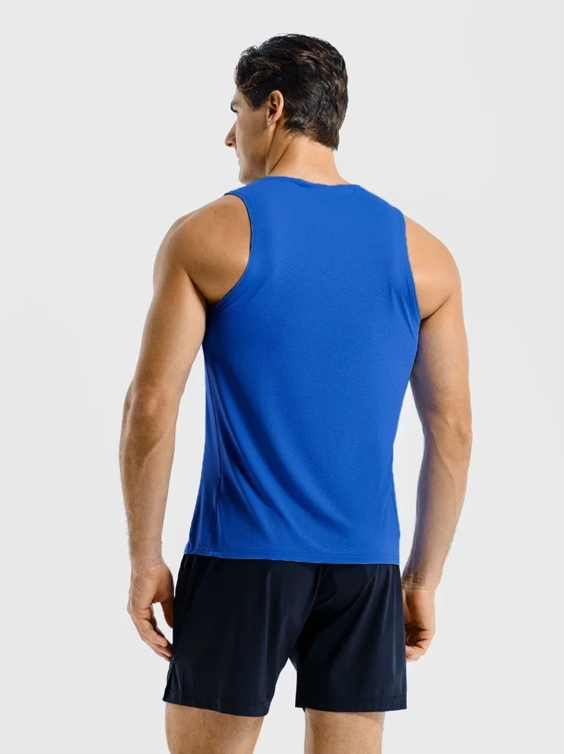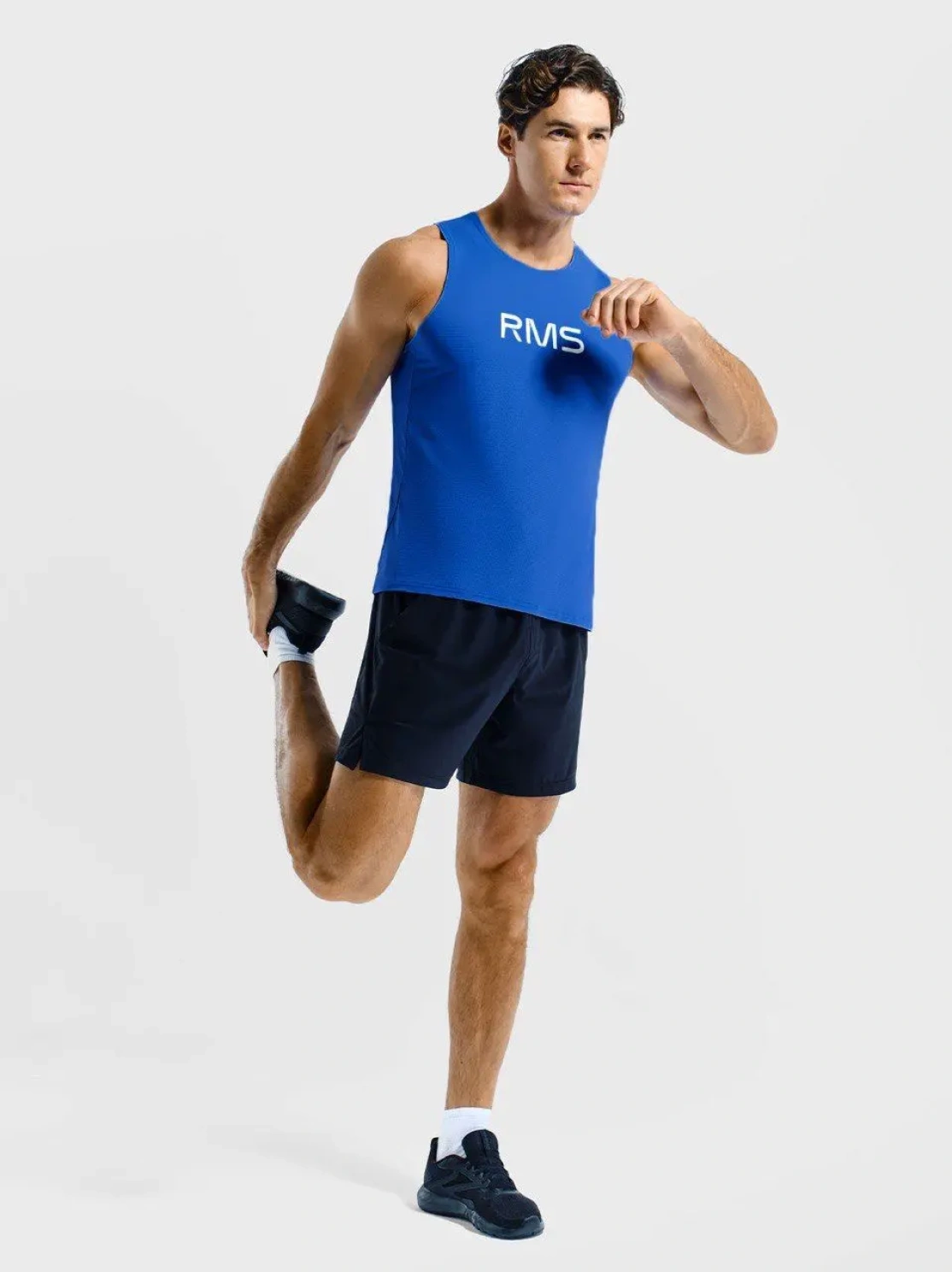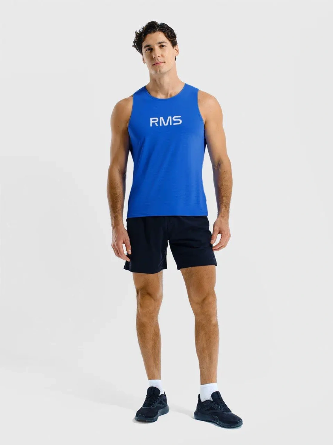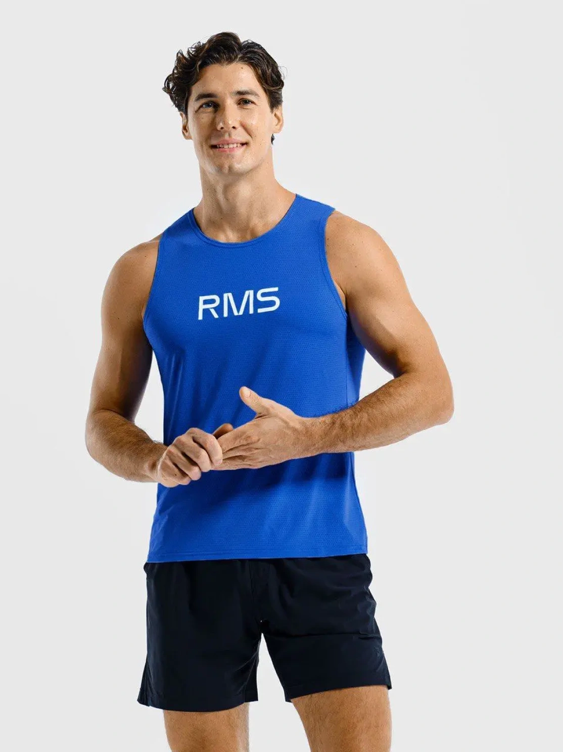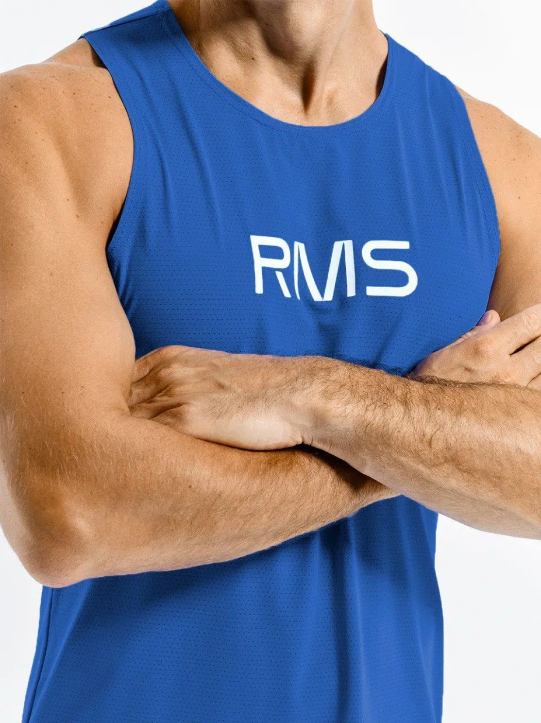 Ультратонкая мужская майка с надписью RMS на груди подойдет для занятий спортом в теплое время года. Облегающий силуэт подчеркнет все достоинства мужской фигуры. Модель выполнена в синей расцветке. Сочетается исключительно со спортивными образами для пробежек и занятий в спортзале.