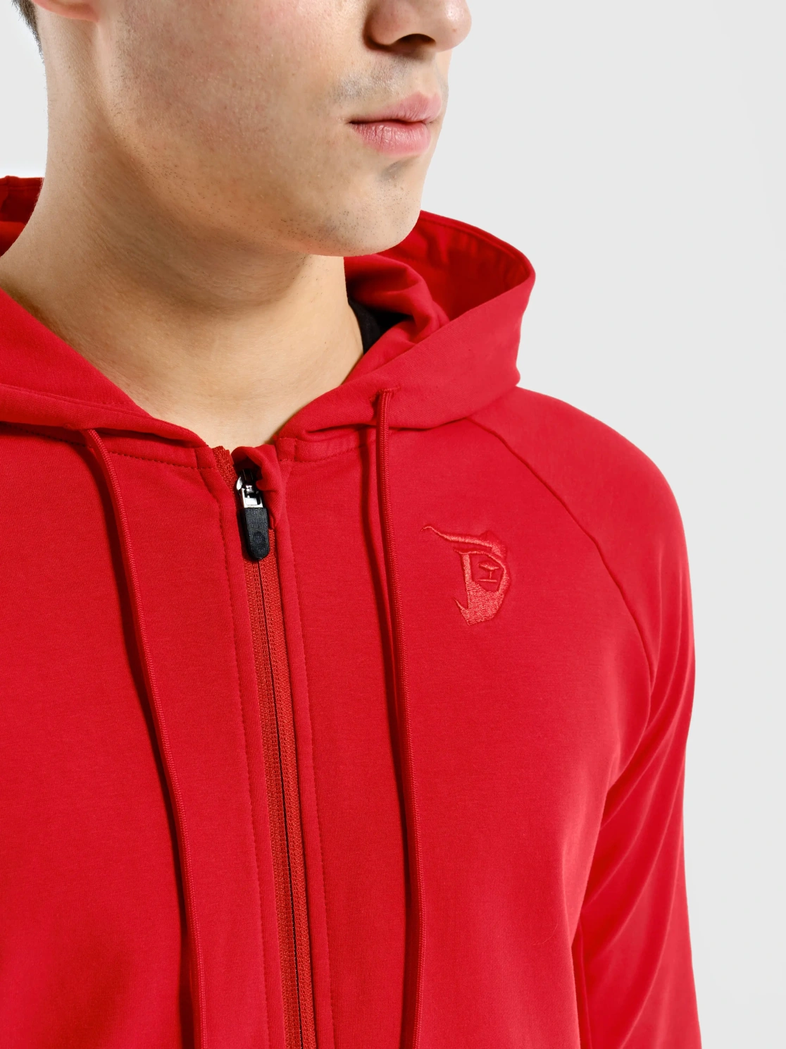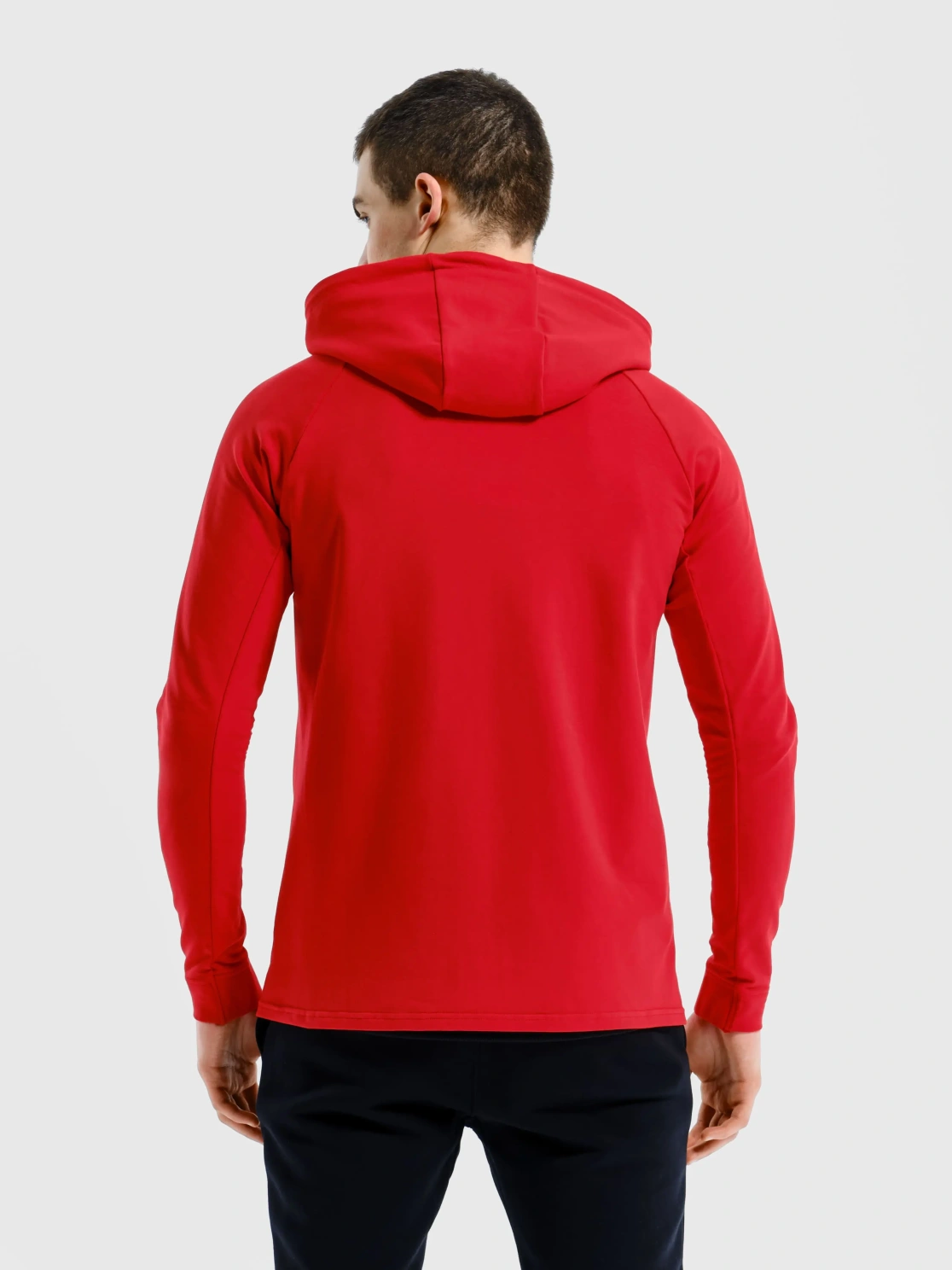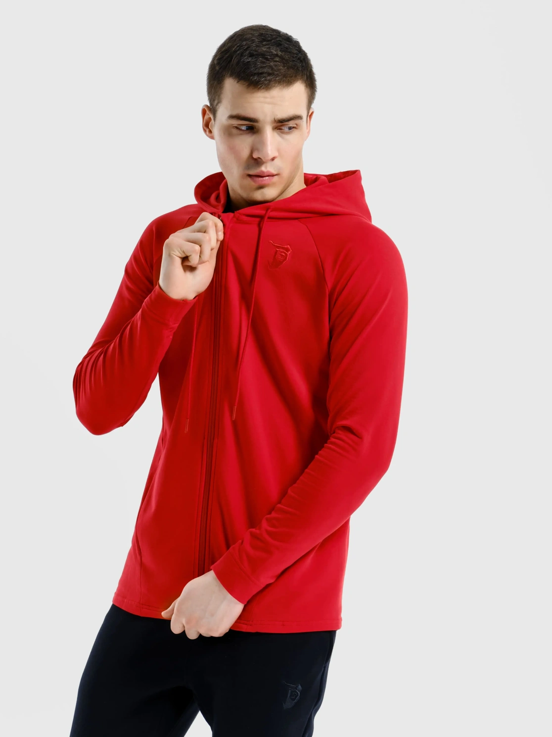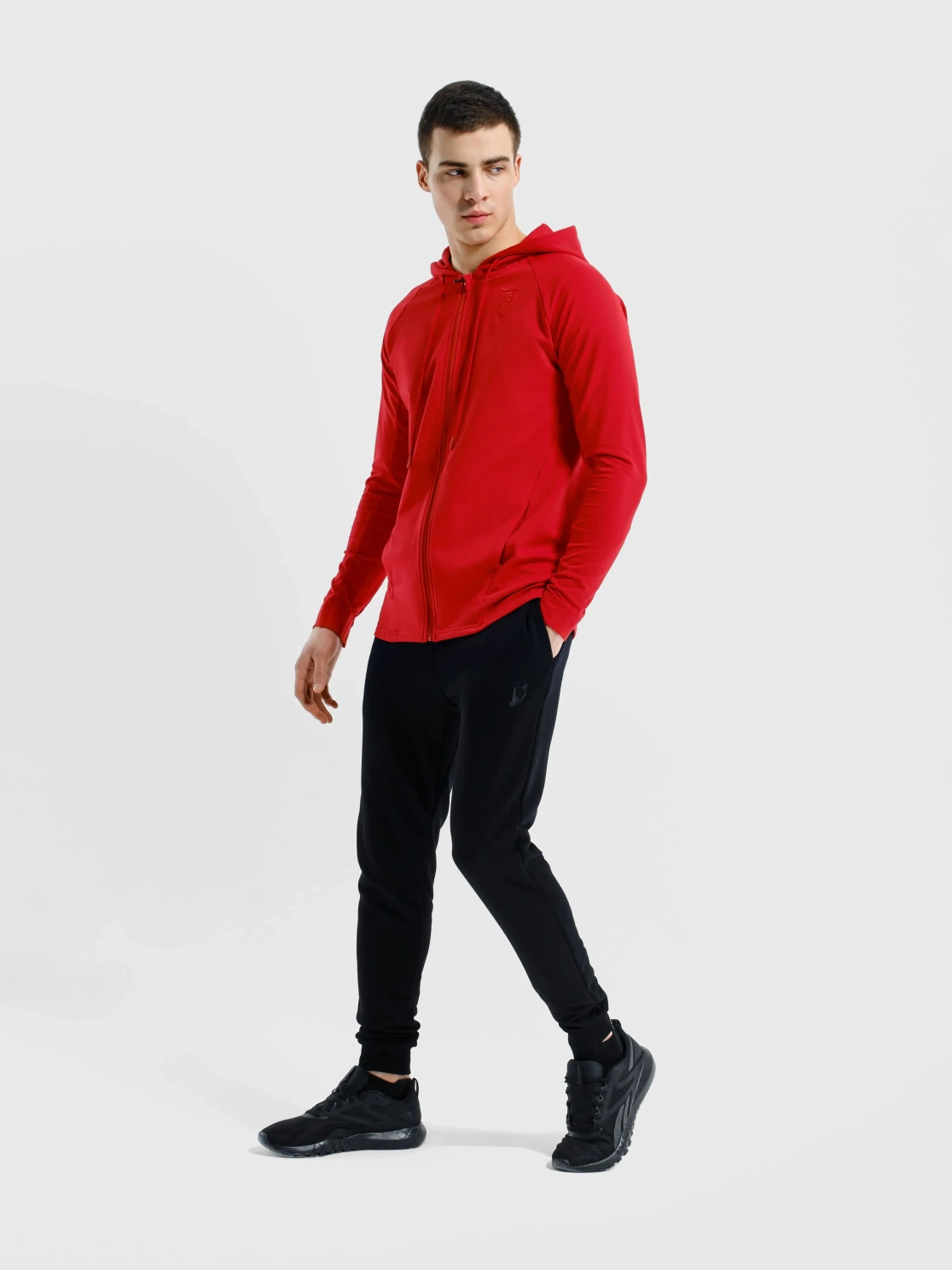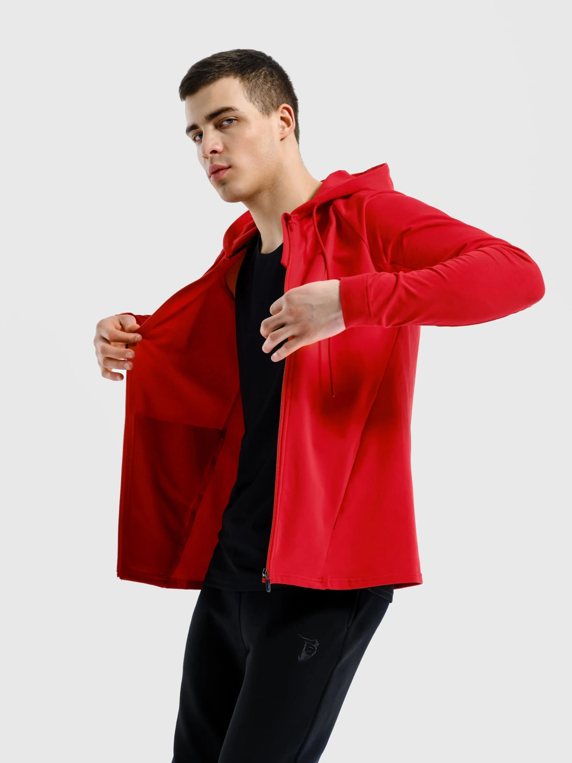 Мужское худи с застежкой-молнией спереди, капюшоном и логотипом медведя на груди в красном цвете. Защищает от ветра и других проявлений непогоды весной-осенью. Подходит для пробежек, потому что не сковывает движения и не доставляет другого дискомфорта.