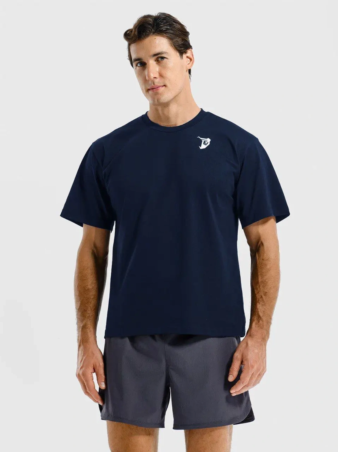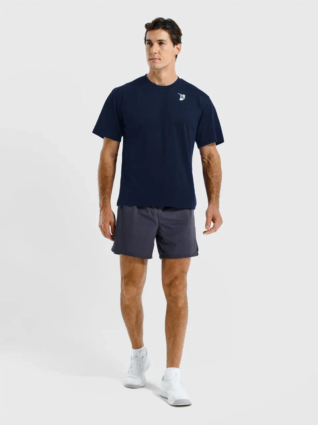 Мужская короткая футболка в темно-синем цвете станет незаменимым элементом гардероба для любого мужчины. Качественный материал обеспечивает комфорт и свободу движений в течение всего дня. Логотип, выполненный в том же цвете, придает изделию стильный и современный вид. Футболка прекрасно сочетается с джинсами, шортами или спортивными брюками. Подойдет как для повседневной носки, так и для активного отдыха.