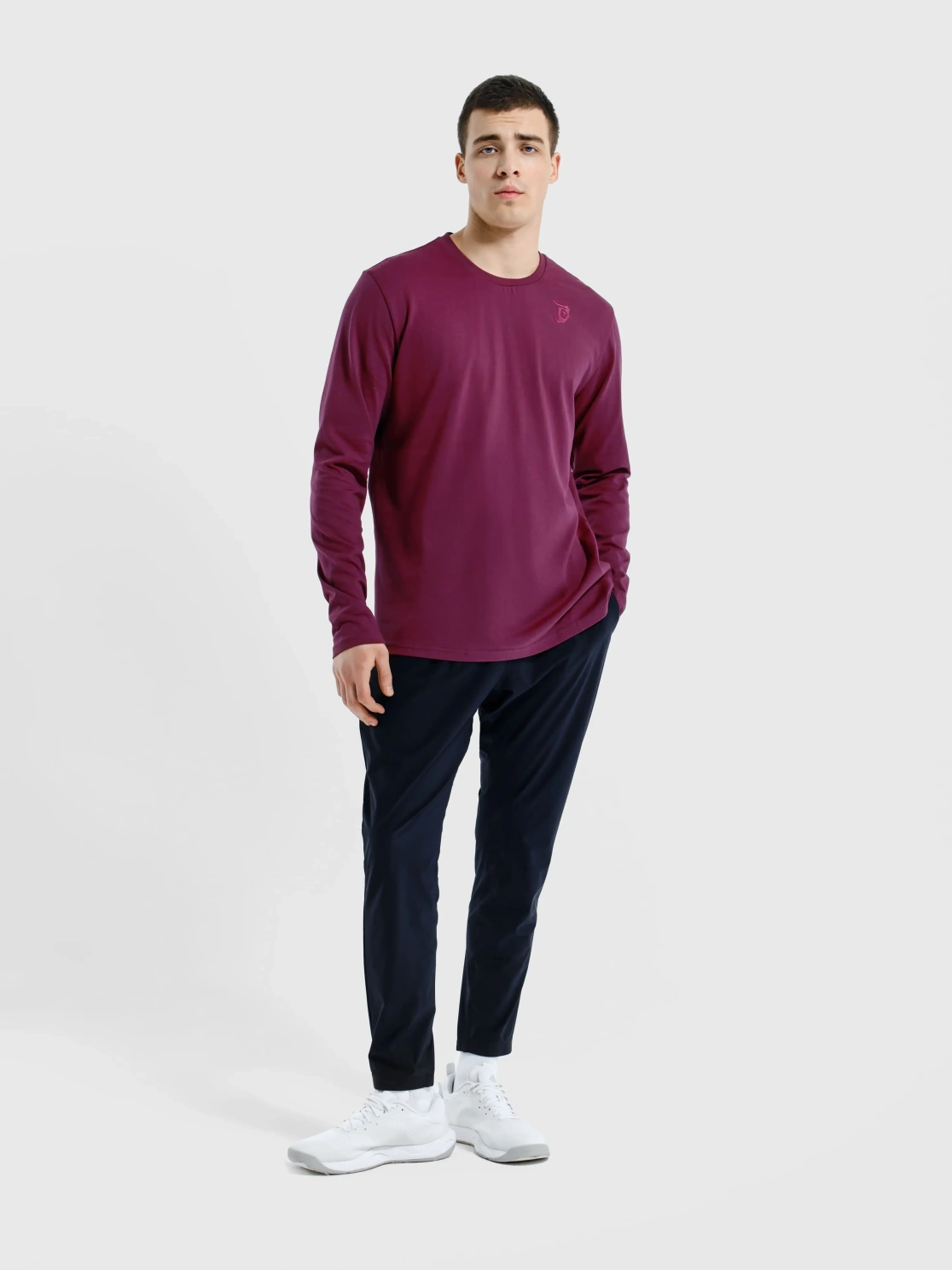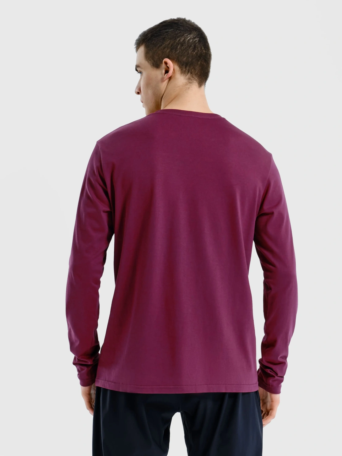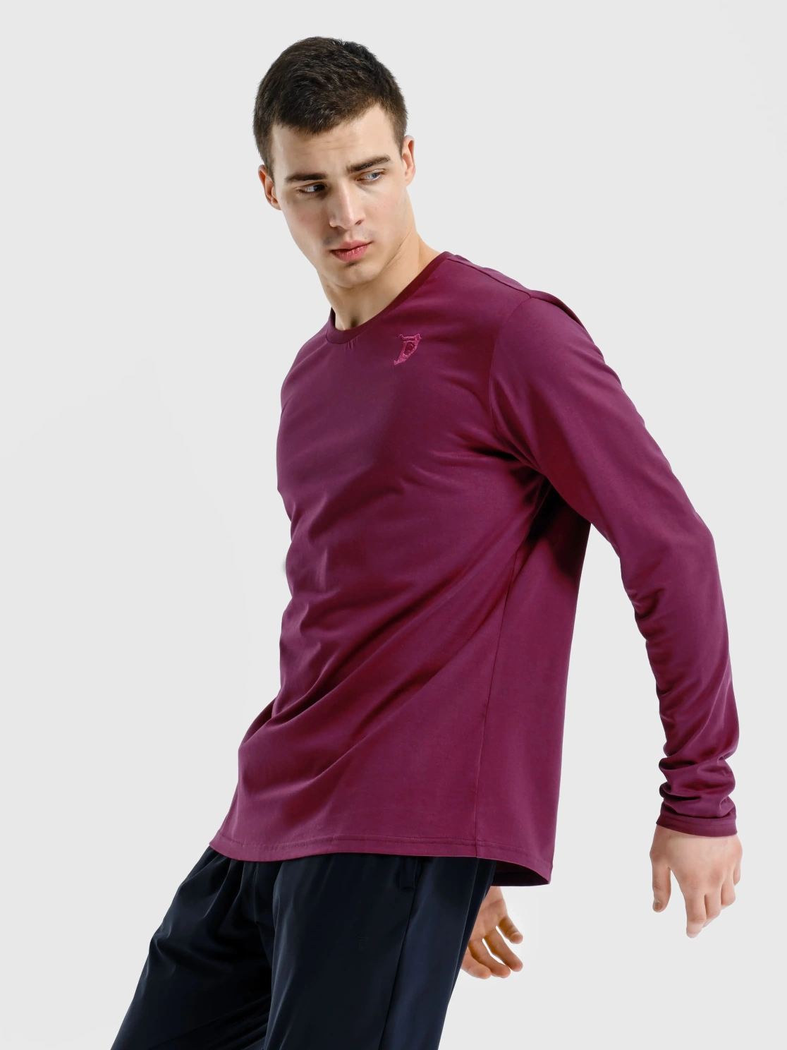 Мужской лонгслив в винном цветовом варианте. Хорошо сочетается с одеждой для тренировок, а также будет стильно смотреться с вещами в спортивном стиле. На груди логотип медведя. Фасон прямой, не стесняющий движений.