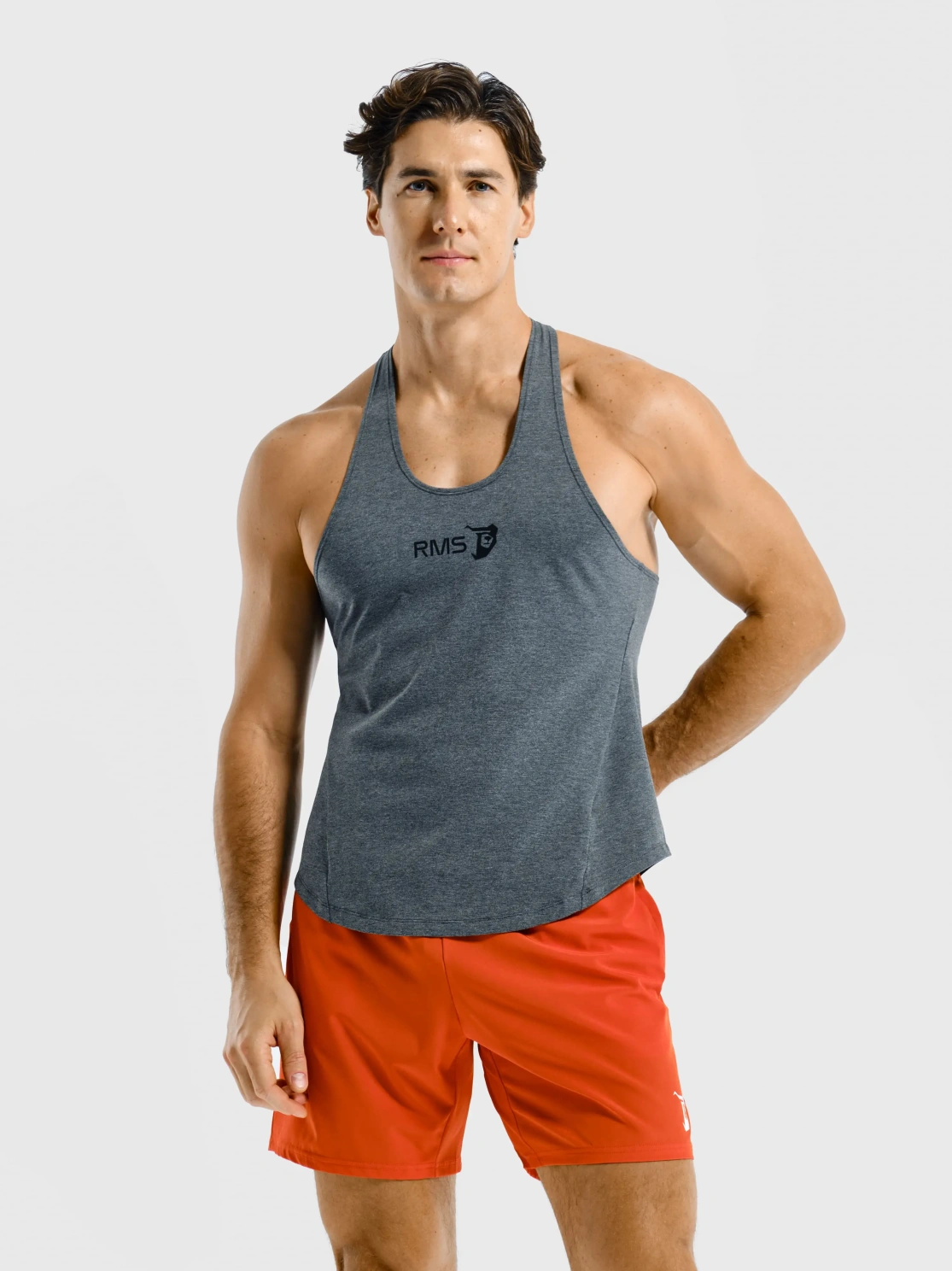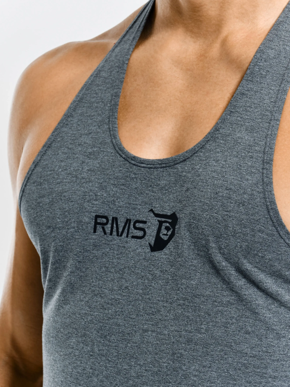 Подчеркивающая мужскую фигуру майка без рукавов с надписью RMS и логотипом медведя на груди серого цвета. Идеально подходят как под трикотажные спортивные брюки, так и под шорты. Теперь интенсивные тренировки в спортзале не проблема.