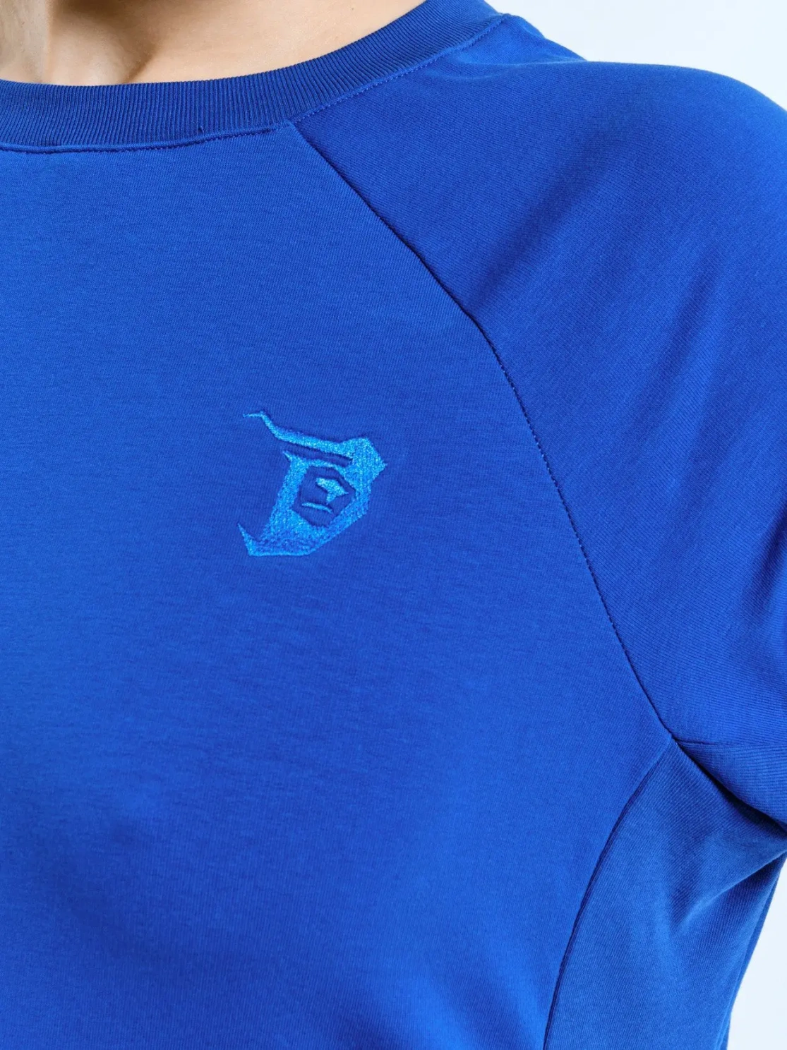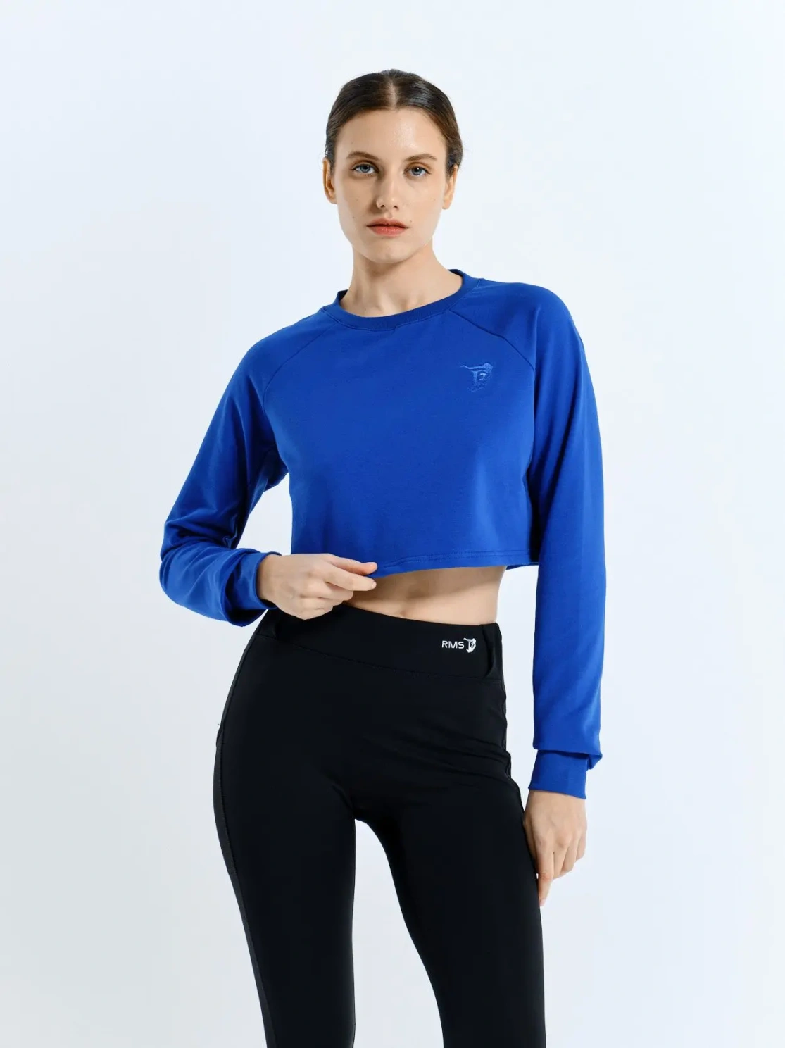 Женское кроп-худи с логотипом медведя на груди. Модель подходит не только для спорта, но и для аутфитов в спортивном стиле. Подчеркивает линию живота и груди. Выполнена в синем цвете. Длинные рукава изделия позволяют заниматься спортом в прохладном помещении.