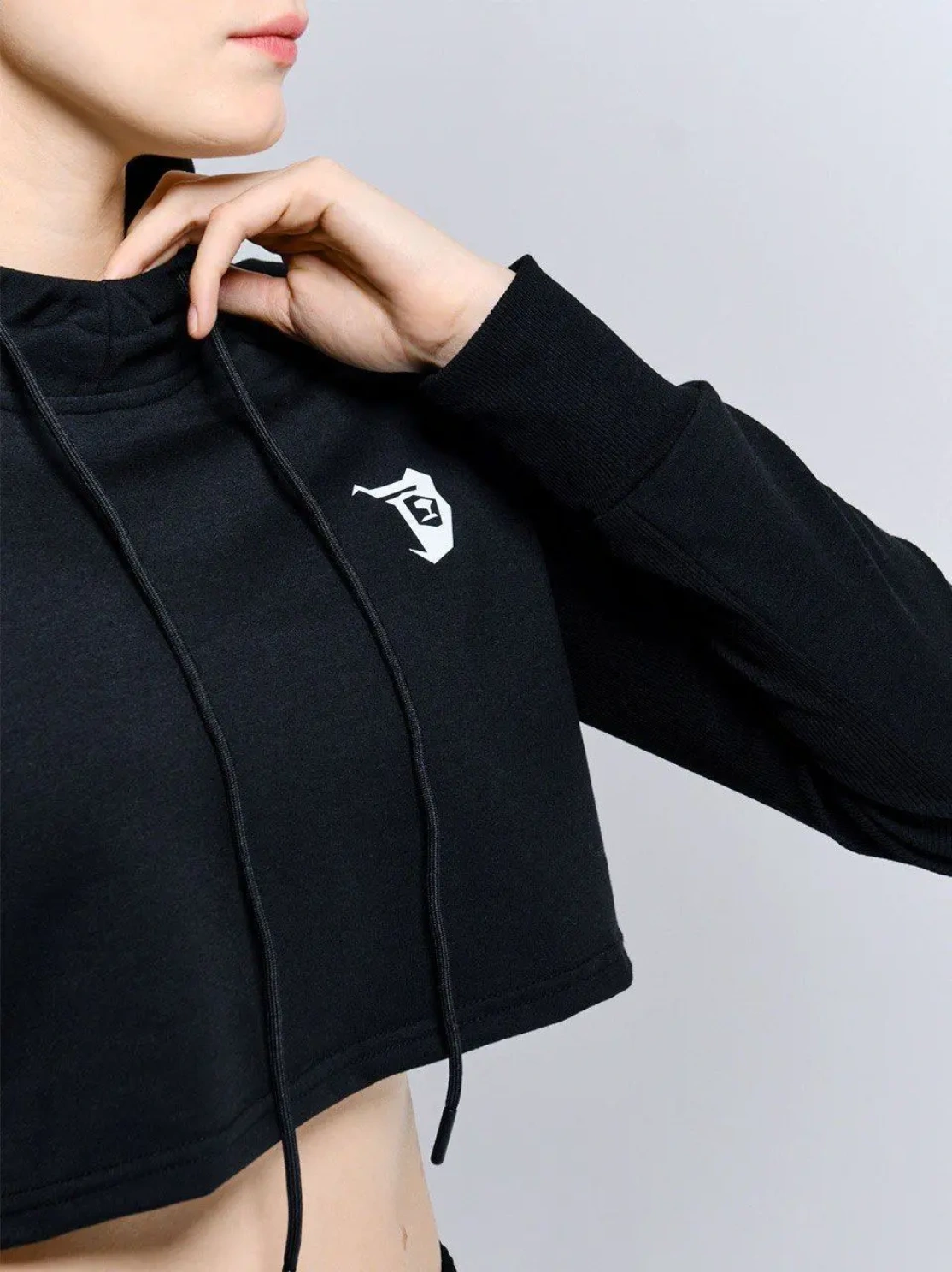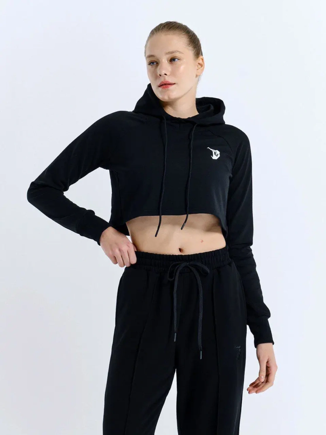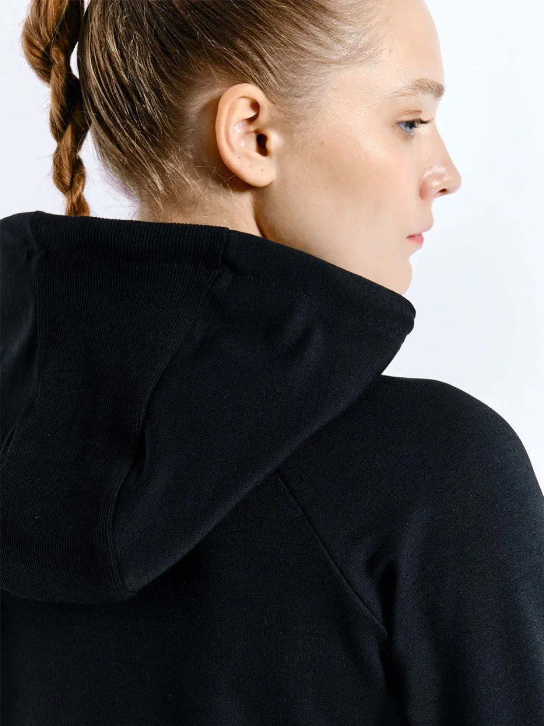 Женское укороченое худи с капюшоном и логотипом медведя на груди. Выполнено в черном цвете. Подходит не только для спорта, но и для прогулок, а также ежедневных аутфитов в спортивном стиле. Хорошо сочетается со спортивными брюками, с джинсами высокой и средней посадки и с леггинсами. Не стесняет движений и не мнется при долгой носке.
