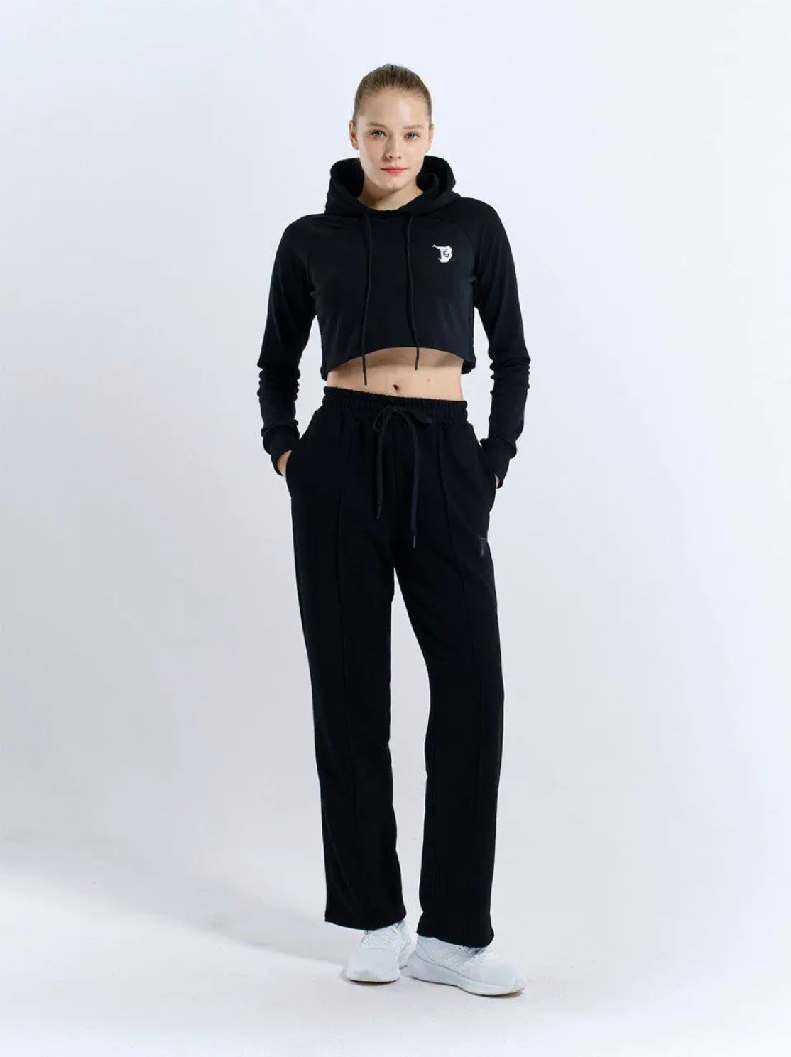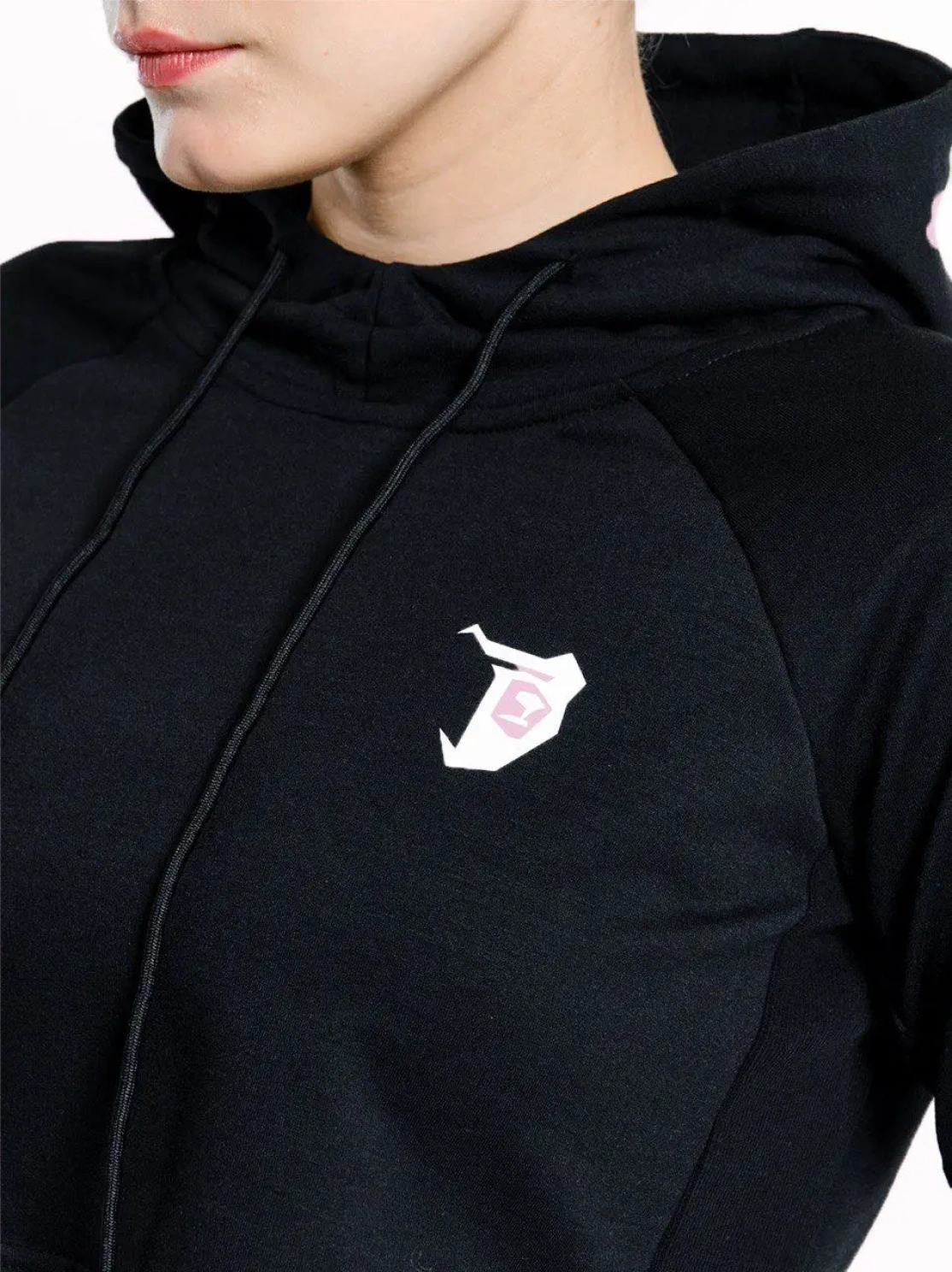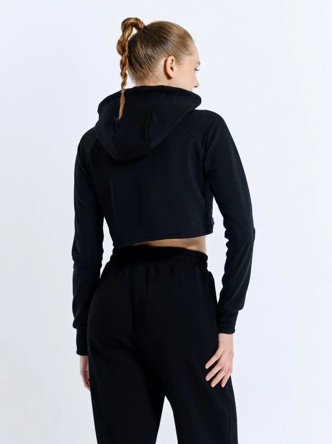Женское укороченое худи с капюшоном и логотипом медведя на груди. Выполнено в черном цвете. Подходит не только для спорта, но и для прогулок, а также ежедневных аутфитов в спортивном стиле. Хорошо сочетается со спортивными брюками, с джинсами высокой и средней посадки и с леггинсами. Не стесняет движений и не мнется при долгой носке.